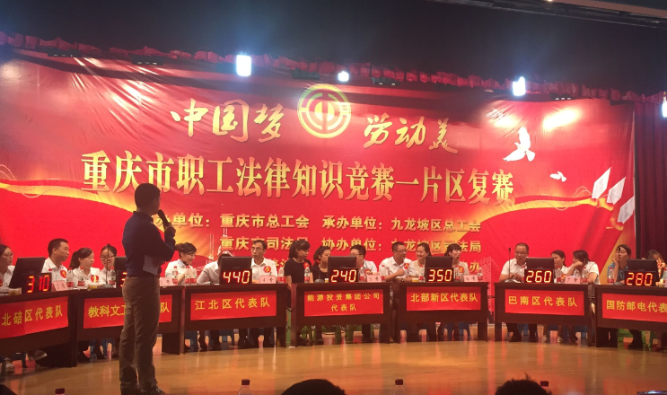 为充分落实重庆市总工会普法工作要求,展示全市职工风采,弘扬“中国梦•劳动美”的时代主题,助推依法治国进程,8月19日在重庆市总工会在九龙坡区文化中心举行了重庆市职工法律知识竞赛片区复赛,九龙坡区总工会、巴南区总工会、北部新区总工会、江北区总工会、北碚区总工会、教育文卫体工会、交通建设工会、重庆能源投资集团工会、国防邮电工会9支代表队参加了比赛。