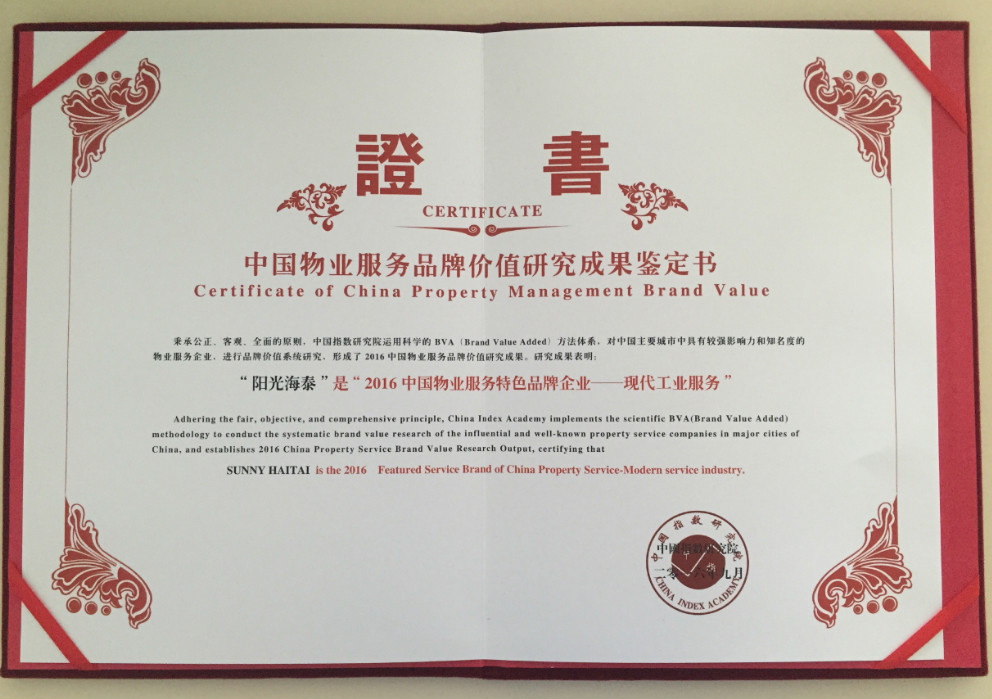 会上,重庆海泰管理服务有限公司(以下简称阳光海泰)荣获“2016中国物业服务特色品牌企业——现代工业服务”殊荣。